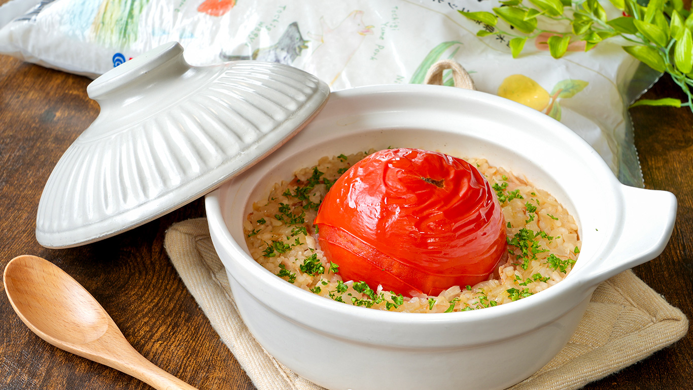 つややかで弾力のある「とちほのか」の食感が、トマトの酸味とベーコンの旨みをしっかりと受け止め、口いっぱいに広がるバランスの取れた一品。土鍋でじっくり炊くことでお米一粒一粒にトマトの旨味が染み込み、噛むほどに甘みが増します。シンプルながら奥深い味わいで、イタリアンの要素を手軽に楽しめる炊き込みご飯です。